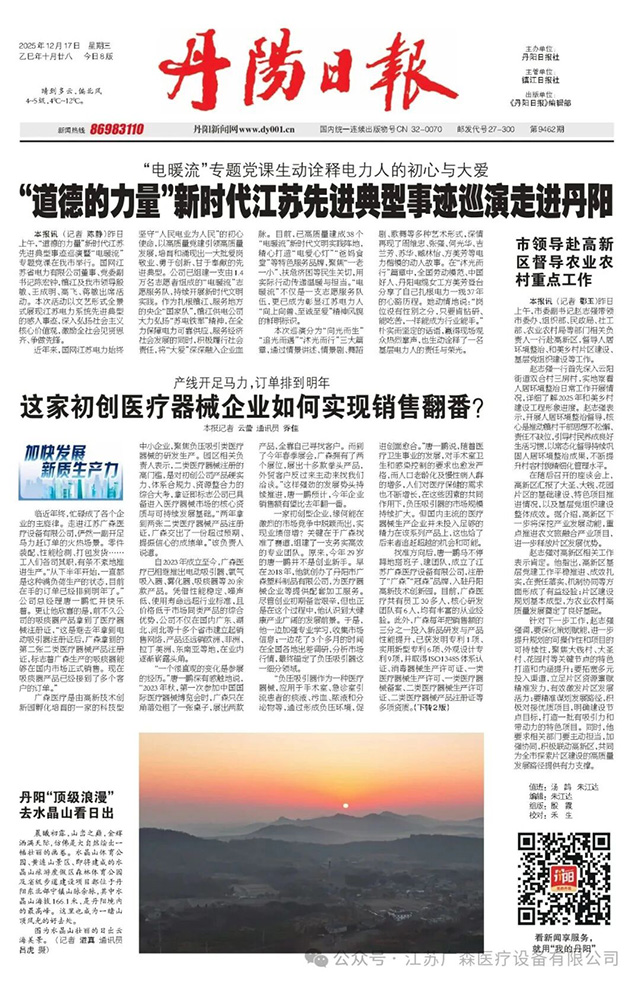 This publication in Danyang Daily is a recognition of Guangsen Medical's past development and a new starting point. In the future, Guangsen Medical will continue to take root in the fertile land of Danyang High tech Innovation Park, live up to the cultivation and expectations of the park, and continue to deepen its cultivation in the field of negative pressure attraction medical devices. With more solid research and development, higher quality products, and more comprehensive services, it will continuously enhance its core competitiveness, promote sustained order growth, and expand its domestic and international market territory.